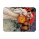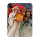 Ein weiterer Vintager, flexibler Halloween-Magnet mit einer Frau mit einem Jack O'Lantern und zwei Eulen, gemalt vom amerikanischen Illustrator Samuel Loren Schmucker.
