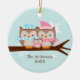 Weihnachtsschmuck mit einer bezaubernden Eulenfamilie, die auf einem Zweig in sanften Pastellfarben steht.