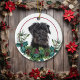 An der Vorderseite dieses Holiday-Ornaments befindet sich ein schönes Porträt eines dunkelgrauen oder schwarzen Schnauzer-Hundes, der aus einem heiligen und immergrünen Hut pinkelt. Rote Beeren und Kiefernkonen schmücken die heiligen und kiefernroten Früchte. Das Bild wird auf einem weißen Kreis in einem dünnen roten Kreis platziert. Die Rückseite des Ornaments hat den gleichen immergrünen Kranz und Kreis mit Ihrem benutzerdefinierten Text in rot.