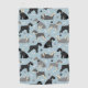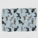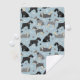 Niedliche Schnauzer-Hunde in Schwarz, Salz und Pfeffer und Schwarz- und Silbermäntel sitzen, stehen und rollen mit verstreuten Hundeknochen und Pfotendrucken auf hellblauem Hintergrund.