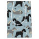 Niedliche Schnauzer-Hunde in Schwarz, Salz und Pfeffer und Schwarz- und Silbermäntel sitzen, stehen und rollen mit verstreuten Hundeknochen und Pfotendrucken auf hellblauem Hintergrund.