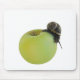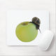Eine schmale Schnecke knistert über einem grünen Apfel,