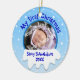 Diese kundenspezifische Foto Weihnachtsverzierung hat einen Kreisbereich, in dem Sie das Bild Ihres Babys setzen können. Die Verzierung sagt, "mein erstes Weihnachten." Unter ihr gibt es einen Stapel des Schnees, und Sie können Ihren individuellen Namen und das Jahr addieren, um ihn zu personifizieren.