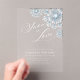 Feiern Sie Liebe mit unserem Schnee in Liebe Brautparty Akryllische Einladung mit eleganten Aquarellschneeflocken in weichem staubblauen. Die moderne Kalligraphie-Schrift und die silbernen Glitzer-Akzente fügen eine schicke, festliche Touch hinzu, die sich perfekt für ein winterliches Wunderland-Brautparty eignet. Diese Einladung verbindet ein gemütliches Winterthema mit raffinierten Designelementen und ist somit die ideale Wahl für eine Weihnachtsfeier. Vollständig anpassbare Texte erlauben es Ihnen, sie wirklich persönlich zu machen.