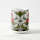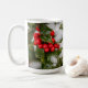 Tief grüne heilige Blätter mit hellroten Beeren kontrastieren mit frisch gefallenem Schnee.
