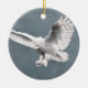 Eine schneebedeckte Eule gegen eine bewölkte Hintergrundlandung auf einer Niederlassung.