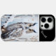 Eine schneebedeckte Eule steht auf einem verschneiten Ast, der von Schnee und Eiskeln bedeckt ist. Die hellgelben Augen konzentrierten sich auf den Betrachter. Die weißen und grauen Federn der Eule harmonieren nahtlos mit der Winterlandschaft.