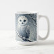 Schöne Schneeeule mit auffallend blauen Augen, die während des Schneefalls auf einem frostigen Baumarm gekrönt sind. Dieses atemberaubende Bild, das Ruhe und Winterwundern hervorruft, spiegelt das Wesen der Natur in den kalten Jahreszeiten wider.