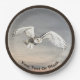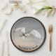 Eine digitale Darstellung einer Schneekugel (Bubo scandiacus) überlagert auf einem winterlichen, grauen Himmelshintergrund. Fügen Sie Ihren eigenen Text hinzu. Die bodennistende Snowy Owl ist in den arktischen Regionen Nordamerikas und Eurasiens endemisch. Männchen sind fast rein weiß, während Weibchen, wie in diesem Bild, mehr dunkle Flecken und Balken in ihrem Absturz haben.