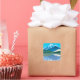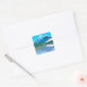 Square Sticker in einem digitalen Bild von schneebedeckten Bergen und Kiefernwäldern, reflektiert in einem See, unter einem tiefen blauen Himmel