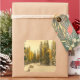 Weihnachtsaufkleber mit einem schönen Naturfoto. Ein abgeschiedener Winterweg mit hohen schneebedeckten Kiefern. Eine goldene Dämmerung schafft ein zauberhaftes Gefühl für dieses Foto.