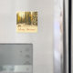 Ein Magnet mit einem schönen Naturfoto. Ein abgeschiedener Winterweg mit hohen schneebedeckten Kiefern. Eine goldene Dämmerung schafft ein zauberhaftes Gefühl für dieses Foto.