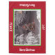 Feierliche Winterszene mit schneebedeckten Bäumen und Ästen in einer Winternacht. In der Ferne liegt ein hell erleuchteter Weihnachtsbaum, der sich im grünen, weißen Rahmen des Zentrums glänzt. Frohe Weihnachten wird an beiden Enden in schneebedeckter weißer Schrift geschrieben. Frieden und Freude sind in weißem Text geschrieben, lange Seiten von mittlerer Größe. Original Fotografie und Design © TamiraZDesign.