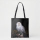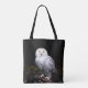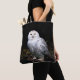 Tierporträtfotografie der majestätischen, schneebedeckten Eule, die auf einem Zweig stehend ist.