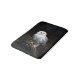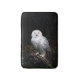 Tierporträtfotografie der majestätischen, schneebedeckten Eule, die auf einem Zweig stehend ist.