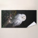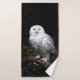 Tierporträtfotografie der majestätischen, schneebedeckten Eule, die auf einem Zweig stehend ist.