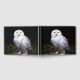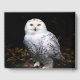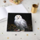 Tierporträtfotografie der majestätischen, schneebedeckten Eule, die auf einem Zweig stehend ist.
