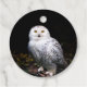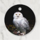 Tierporträtfotografie der majestätischen, schneebedeckten Eule, die auf einem Zweig stehend ist.