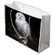 Tierporträtfotografie der majestätischen, schneebedeckten Eule, die auf einem Zweig stehend ist.