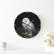 Tierporträtfotografie der majestätischen, schneebedeckten Eule, die auf einem Zweig stehend ist.