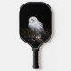 Tierporträtfotografie der majestätischen, schneebedeckten Eule, die auf einem Zweig stehend ist.