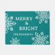 Feierliche Urlaubstüre mit fröhlicher und heller Typografie, weißem Schneeflocken auf Aquamarinem Hintergrund. Personalisieren mit Familiennamen.