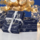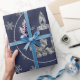 Schneeflocken leuchtet Stechpalmen-blaues und silbernes Grau-Weihnachtsgeschenk-Verpackungs-Papier mit individuellem Namen und Text, elegante Ferienzeit-Geschenk-Verpackung mit Schneeflockemuster durch