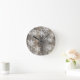 Eine Aufregung der weißen Schneeflocken ist Set auf einem Hintergrund der rustikalen braunen hölzernen Bretter, zum dieser themed Wanduhr des reizenden Winters herzustellen.