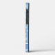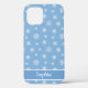 Dekorieren Sie Ihr Handy für die Festsaison! Das Design weist ein modernes Vektormuster von weißen Schneeflocken auf einem babyblauen Hintergrund auf. Personalisieren Sie dieses Weihnachts- und Winterdesign mit dem Namen Ihrer Wahl.
