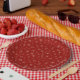 Schneeflockenmuster auf Rot von Contemporary PUP Artist, KiniArt. © Kim Niles, KiniArt™ - Alle Rechte vorbehalten.