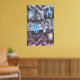 Große, blaue Schneeflocken hängen in der Luft vor nackten Baumzweigen, die beeindruckende, fantasieähnliche Lila-Schneeflocken im Hintergrund überlagern.