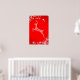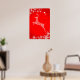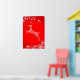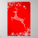 Weiße Schneeflocken und ein Rentier auf rotem Hintergrund