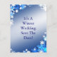 Ein Sprinkling hübscher blauer Schneeflocken umrahmt diesen Typ auf der Postkarte und macht ihn perfekt für die Winterhochzeit. Dies Save the Date ist Teil einer vollen Hochzeitslinie, aber wenn zusätzliche Stücke benötigt werden, nur lass uns wissen.
