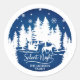 Weihnachtsrundaufkleber mit weißen Kiefern-Silhouetten mit Schneeflocken und einem Pferd gezeichnet Schlitten auf blauem Hintergrund, mit dem Wortlaut Stille Nacht in handgeschriebener Schrift. Benutzerfreundlich, indem Sie Ihren eigenen Familiennamen oder Text hinzufügen