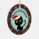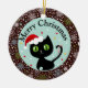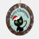Die vairous Schneeflockenformen sind in Limonem, in aquamarinem und Weiß mit den gleichen Farbpunkten und -sternen im sehr dunklen schokoladenbraunen Hintergrund. Die schwarze Katze in der Mitte mit einer Weihnachtsmannmütze und einer Zuckerstange auf seiner Geschichte. Das Rote, das Weiß und die Goldsterne im aquamarinen Hintergrund. Dieses ist eine digitale Illustration.