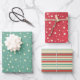Vintage/Retro-Urlaubsmuster aus der Mitte des Jahrhunderts mit "Schneeflocken", weißen Kreise auf pastelltürkisfarbenen und roten Hintergründen, sowie einem Blatt mit türkisfarbenen und roten horizontalen Streifen. Ein tolles Trio mit Retro-gefärbten Weihnachtsverpackungen!