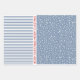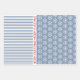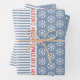 Schneeflocken, Weihnachtsbäume und Streifen staubige blaue Wrapping Paper Sheets mit roten Weihnachtswünsche. Ein Blatt zeigt ein niedliches Muster von Schneeflocken und Streifen auf staubblauem Himmel. Der zweite ist mit Schnee und den dritten weißen Bäumen bepflanzt. Es gibt auch den Text "Frohe Weihnachten" in rot auf allen Blättern. Personalisieren Sie es mit Ihrem Text.