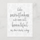 Minimalistisches und elegantes weißes Schneeflockenmuster und ein inspirierend Zitat: "Wie Schneeflocken sind wir alle auf unsere Art schön"