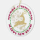 Ein Imitat Glitzer Goldrinder springt gegen silberne Goldschneeflocken, die ihn umherfallen. Das Bild ist umgeben von einem grün gepunkteten Rundrahmen und dem Rundtext in Rot Frohe Weihnachten Neues Jahr. Niedlich! Bild und Text werden auf einem weißen Hintergrund platziert. Die Rückseite des Ornaments hat den gleichen roten und grünen, kreisförmigen Rahmen um Ihren eigenen Text. Ein hübsches Holiday-Ornament, das Sie als Geschenk oder als behalt für sich geben können!