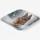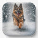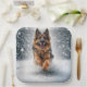 Ein fröhlicher deutscher Hirte schwebt durch einen winterlichen Waldweg, der den weichen Schnee beim Vorwärtsrennen in die Höhe treibt.