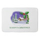 Schneesichere Winterlandschaft mit rauchender Keule aus einer Hütte, schneebedeckten Bäumen, heilig mit Beeren und grünem Band. Nachricht: Die Grüße der Jahreszeit!