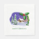Schneesichere Winterlandschaft mit rauchender Keule aus einer Hütte, schneebedeckten Bäumen, heilig mit Beeren und grünem Band. Nachricht: Die Grüße der Jahreszeit!
