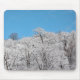 Ein leichter Schneefall hat eine weiße Beschichtung auf einem Baumhang verlassen. Der blaue Himmel fügt der Szene einen deutlichen Kontrast hinzu.