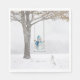 Niedlicher Weihnachtsschneemann mit einem weißen Kaninchen im Winter auf einem Baumschwung.