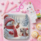 Ein fröhlicher Schneemann trägt einen roten Hut und Schal und hält eine Eistüte mit einem Hund, der ihn im tiefen Schnee sieht