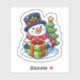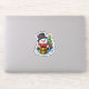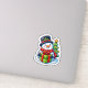 Dieser reizende Urlaubsaufkleber besticht durch einen charmanten Schneemann mit einem Hut, der mit Heiligenverzierungen geschmückt ist. Es liegt neben einem geschmückten Weihnachtsbaum, der ein wunderschön umhülltes, grünes Geschenk hält, das den fröhlichen Geist der Saison verkörpert.