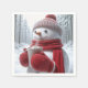 Ein fröhlicher Schneemann, der in einem roten Hut gekleidet ist, Schal und Fäustlinge halten eine dampfende Tasse heißer Schokolade mit Marshmallows