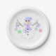 Ein niedlicher Schneemann, der einen Hut und Schal trägt, während er Schneeflocken auf seinen Zweiarmen hält.