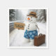 Ein Schneemann per Anhalter, der einen Strohhut und eine Badehose trägt, hält ein 'Florida'-Schild am schneebedeckten Straßenrand, während ein naher Koffer dem Winterbild ein wunderliches Reisethema hinzufügt