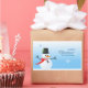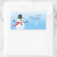 Rechteck-Aufkleber mit niedlichem Schneemann mit rotem Schal und einem schwarzen Hut auf einem blauen Hintergrund, der die Wintersaison genießen kann, da Schneeflocken unterschiedlicher Form behalten werden. Ideal für Weihnachten oder andere Gelegenheiten. Erhältlich auch in anderen Formen. © Morgens 6